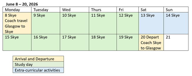 The CELTA School runs from arrival on Monday 8 June to departure on Saturday 20 June, 2026. Participants will stay for 12 nights: with 9 days of study and interactive activities, plus 2 days at the weekend dedicated to extracurricular activities. The arrival and departure days include travel by coach and ferry between Glasgow and Skye and a tour of the Highlands historic sites such as Eilean Donan Castle, enroute.